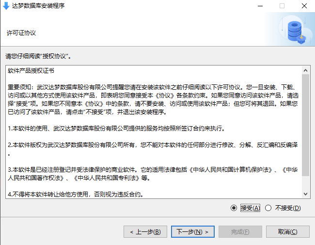 在安装和使用 DM 数据库之前,需要用户阅读并接受许可证协议,如下图所示: