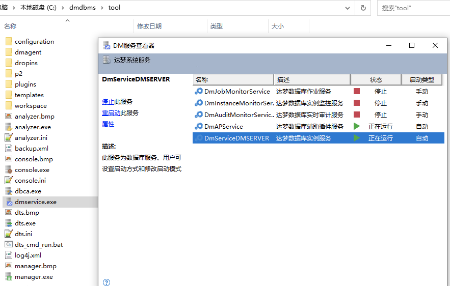 数据库安装路径下 tool 目录,双击运行 dmservice.exe 程序可以查看到对应服务,选择【启动】或【停止】服务。如下图所示: