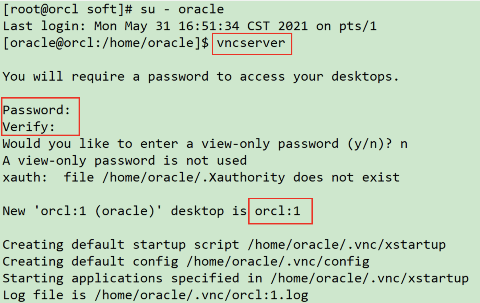 图中的 orcl:1 即 vnc 客户端需要输入的信息,但是由于没有配置 DNS,因此需要把 orcl 换成主机 IP 地址,即:10.211.55.100:1!