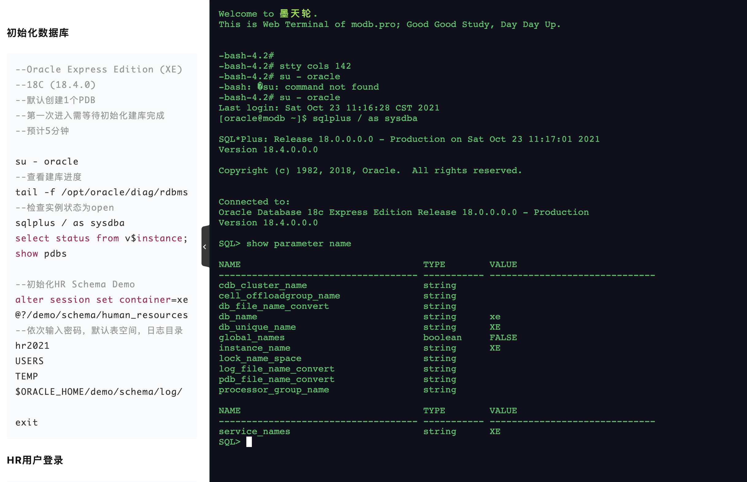 博主曾经也写过 Oracle 的一键安装脚本来部署 Oracle 数据库环境,目的就是为了解决上述的烦恼,感兴趣的可以看看:零基础快速安装 Oracle 本地环境 ,这是题外话了~😄