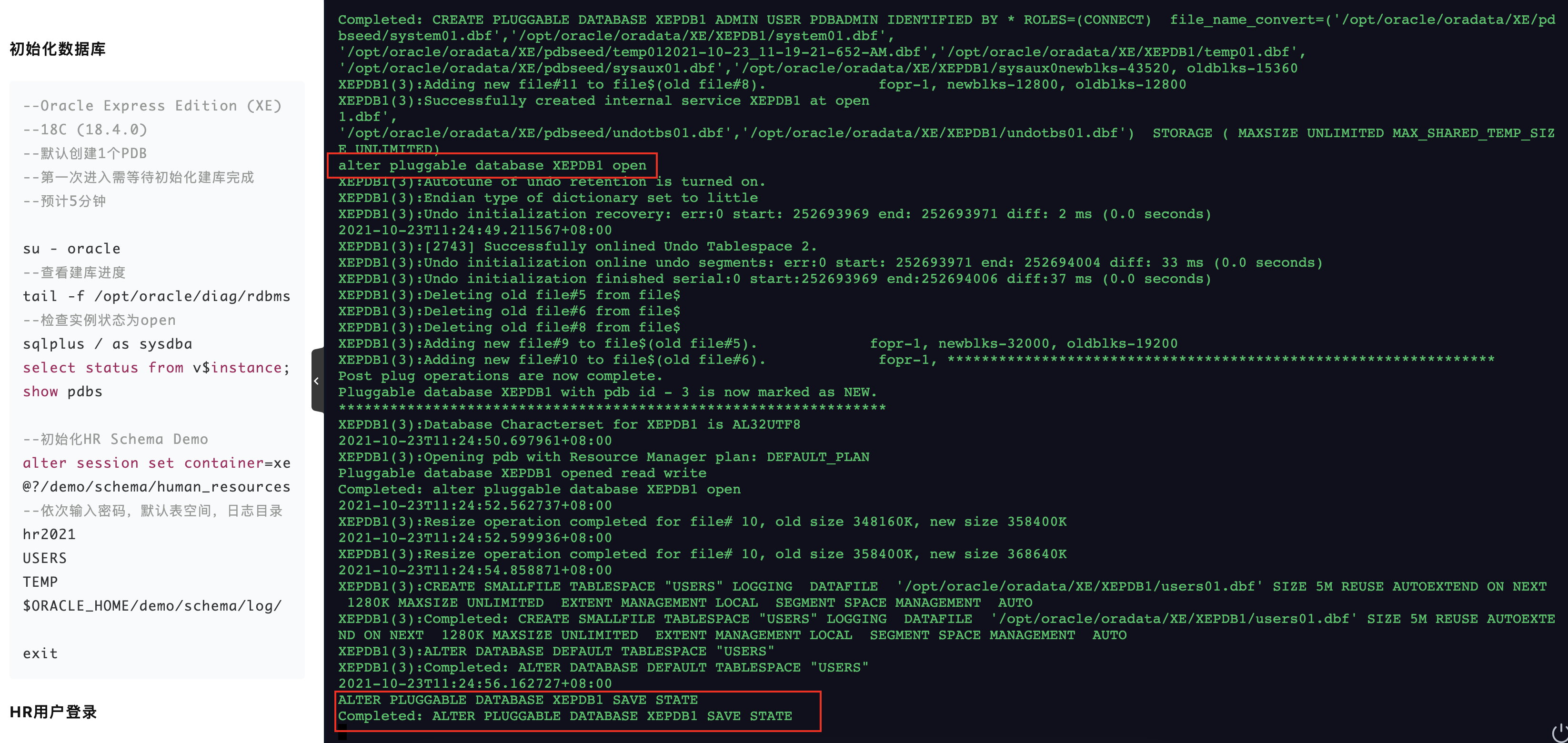 由于 Oracle 数据库初始化比较慢,因此需要等待建库结束才能使用,可以通过以下命令实时查看建库进度: