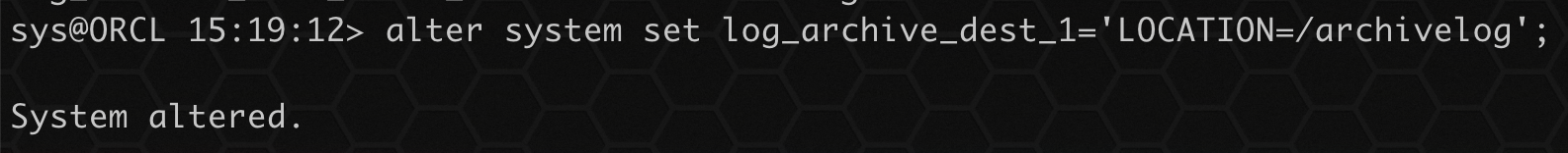 1 | alter system set log_archive_dest_1='LOCATION=/archivelog'; |