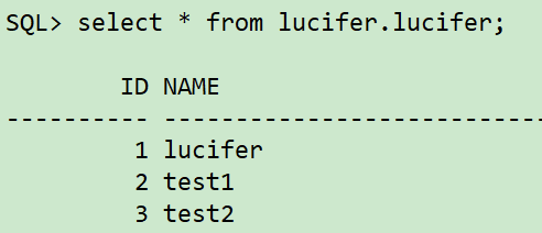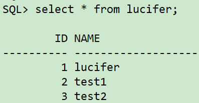 sqlplus / as sysdba ## 创建表空间 create tablespace lucifer datafile '/oradata/orcl/lucifer01.dbf' size 10M autoextend off; create tablespace ltest datafile '/oradata/orcl/ltest01.dbf' size 10M autoextend off; ## 创建用户 create user lucifer identified by lucifer; grant dba to lucifer; ## 创建表 conn lucifer/lucifer create table lucifer(id number not null,name varchar2(20)) tablespace lucifer; ## 插入数据 insert into lucifer values(1,'lucifer'); insert into lucifer values(2,'test1'); insert into lucifer values(3,'test2'); commit;