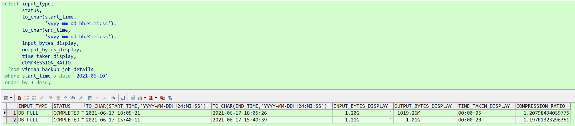 rman target / ## 进入 rman 后执行以下命令 run { allocate channel c1 device type disk; allocate channel c2 device type disk; crosscheck backup; crosscheck archivelog all; sql"alter system switch logfile"; delete noprompt expired backup; delete noprompt obsolete device type disk; backup database include current controlfile format '/backup/backlv0_%d_%T_%t_%s_%p'; backup archivelog all DELETE INPUT; release channel c1; release channel c2; }