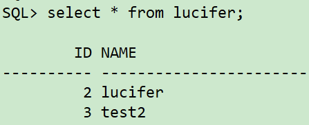 sqlplus / as sysdba conn lucifer/lucifer delete from lucifer whereid=1; update lucifer set name='lucifer'whereid=2; commit;