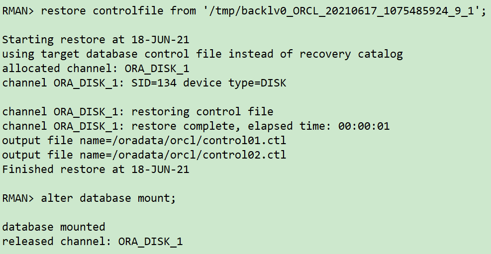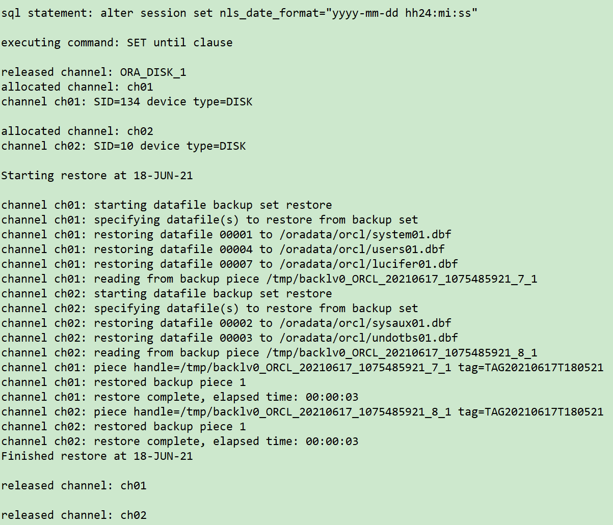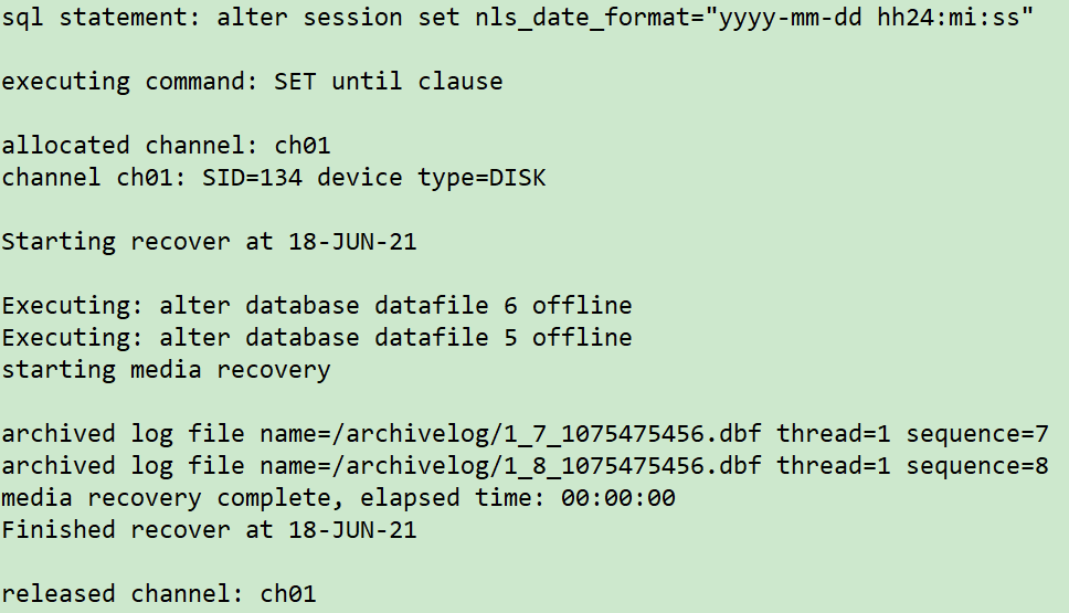 ## 关闭数据库 sqlplus / as sysdba shutdown immediate; ## 开启数据库到mount状态 startup mount pfile='/tmp/pfile.ora'; ## 重复 第7步,往前推进1分钟,调整时间点为 `2021/06/08 18:07:00` rman target / run { sql 'alter session set nls_date_format="yyyy-mm-dd hh24:mi:ss"'; setuntiltime'2021-06-17 18:07:00'; allocate channel ch01 device type disk; recover database skip tablespace LTEST,EXAMPLE; release channel ch01; }