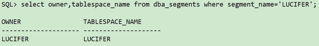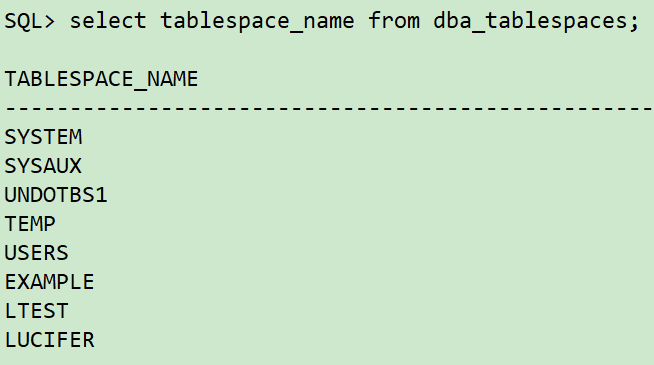 sqlplus / as sysdba ## 查询误更新数据表对应表空间 select owner,tablespace_name from dba_segments where segment_name='LUCIFER'; ## 查询所有表空间 select tablespace_name from dba_tablespaces;