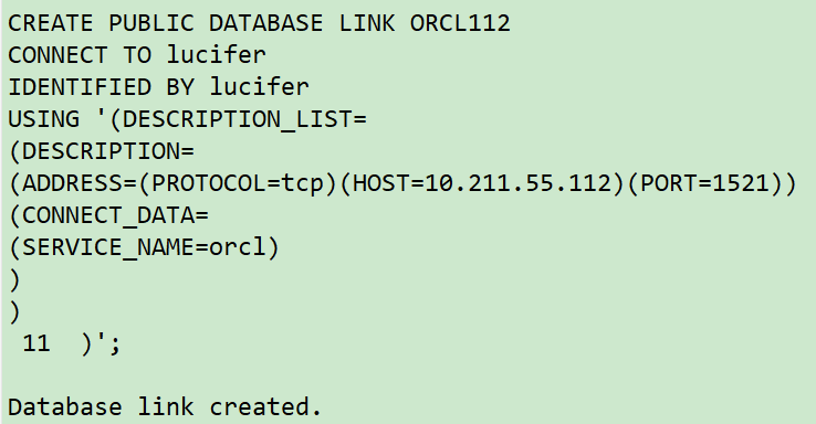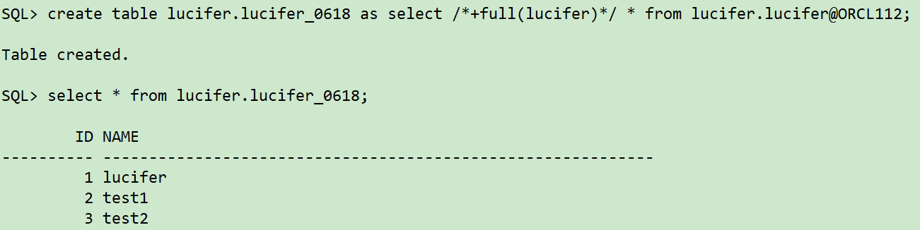 sqlplus / as sysdba ## 创建dblinnk CREATE PUBLIC DATABASE LINK ORCL112 CONNECT TO lucifer IDENTIFIED BY lucifer USING '(DESCRIPTION_LIST= (DESCRIPTION= (ADDRESS=(PROTOCOL=tcp)(HOST=10.211.55.112)(PORT=1521)) (CONNECT_DATA= (SERVICE_NAME=orcl) ) ) )'; ## 通过dblink捞取数据 create table lucifer.lucifer_0618 as select /*+full(lucifer)*/ * from lucifer.lucifer@ORCL112; select * from lucifer.lucifer_0618;