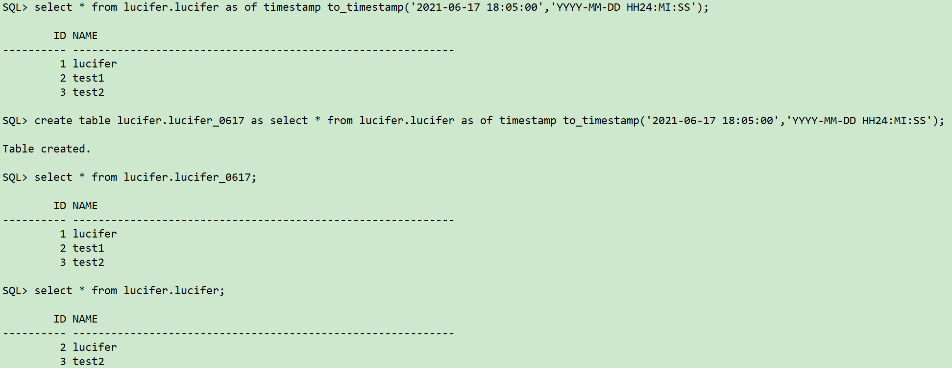 sqlplus / as sysdba ## 查找UNDO快照数据是否正确 select * from lucifer.lucifer as of timestamp to_timestamp('2021-06-17 18:05:00','YYYY-MM-DD HH24:MI:SS'); ## 将UNDO快照数据捞至新建表中 create table lucifer.lucifer_0617 as select * from lucifer.lucifer as of timestamp to_timestamp('2021-06-17 18:05:00','YYYY-MM-DD HH24:MI:SS');