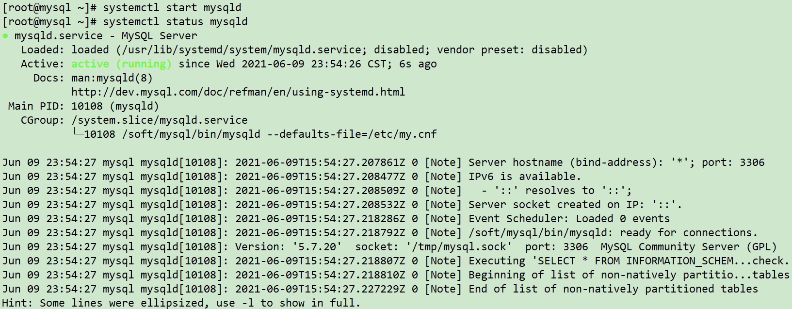 1 | /soft/mysql/support-files/mysql.server start |