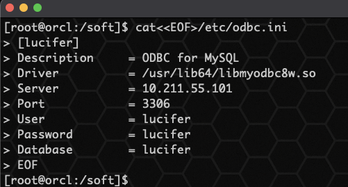 odbc.ini 文件用来存放 MySQL 数据库相关信息,默认不存在,root 用户下手动创建即可: