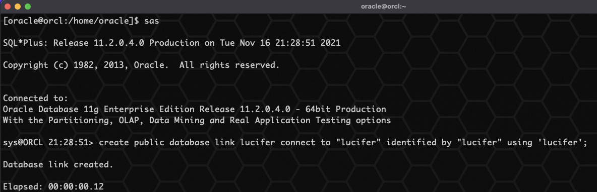 1 | create public database link lucifer connect to "lucifer" identified by "lucifer" using 'lucifer'; |