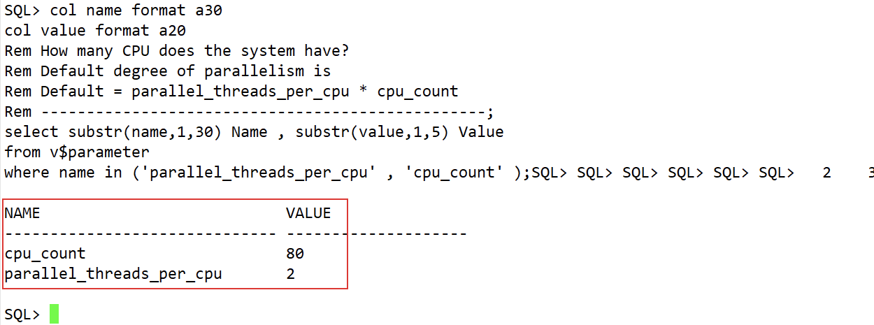 col name format a30 col value format a20 Rem How many CPU does the system have? Rem Default degree of parallelism is Rem Default= parallel_threads_per_cpu * cpu_count Rem -------------------------------------------------; select substr(name,1,30) Name , substr(value,1,5) Value from v$parameter where name in ('parallel_threads_per_cpu' , 'cpu_count' );