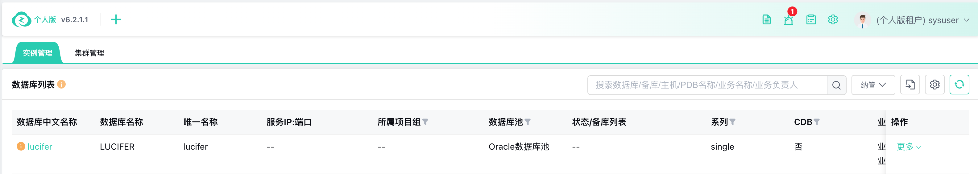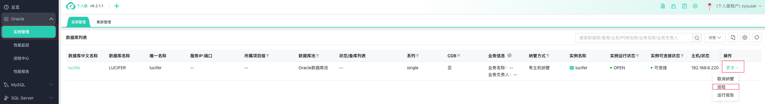在实例管理可以选择巡检进入手工巡检:
