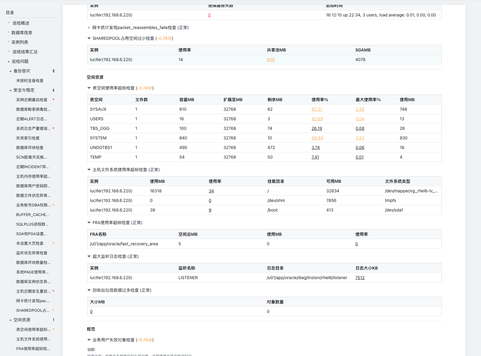 开头会对数据库的整体情况进行一个评分,之后就是每一项的巡检情况以及评分: