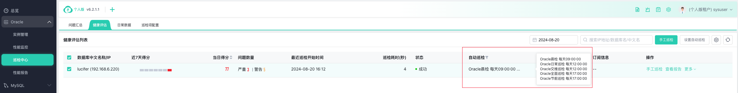 在巡检中心可以设置自动巡检,在健康评估中,可以选择对应的数据库进行自动巡检配置: