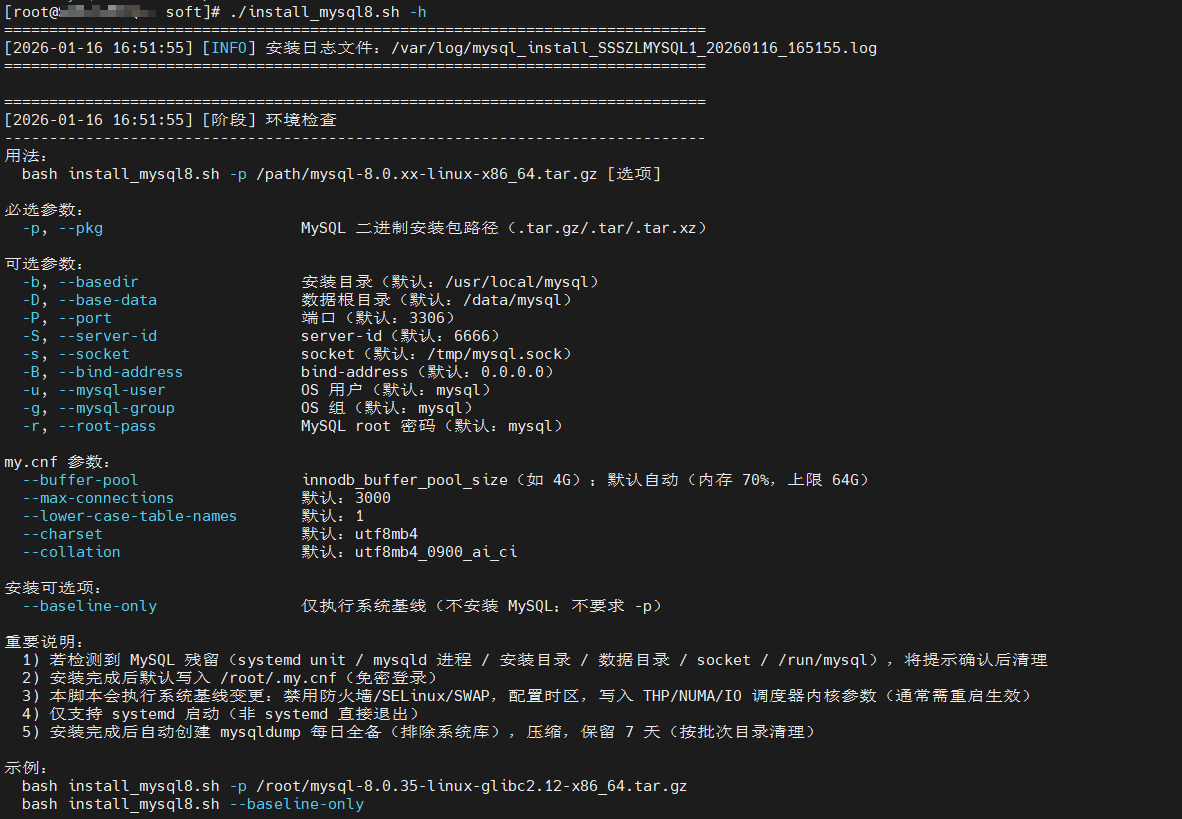 目前本脚本用于在 Linux 主机上通过 MySQL 二进制 tar 包快速完成 MySQL 8.0 的安装部署,并配套基础环境优化、残留清理、日志记录和自动备份能力。脚本运行过程中会将输出同时打印到屏幕并写入日志文件,便于排查问题与留痕。